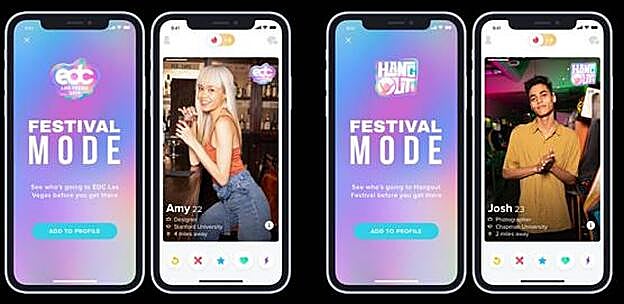 La aplicación ha puesto en marcha el "modo festival", que puedes activar para añadir en tu perfil a cuál de todos vas a asistir para ir preparando el camino. Así te aparecerán no solo los matchs que están más cerca de ti, también podrás empezar a tantear a los que vayan a ir al mismo festival que tú.